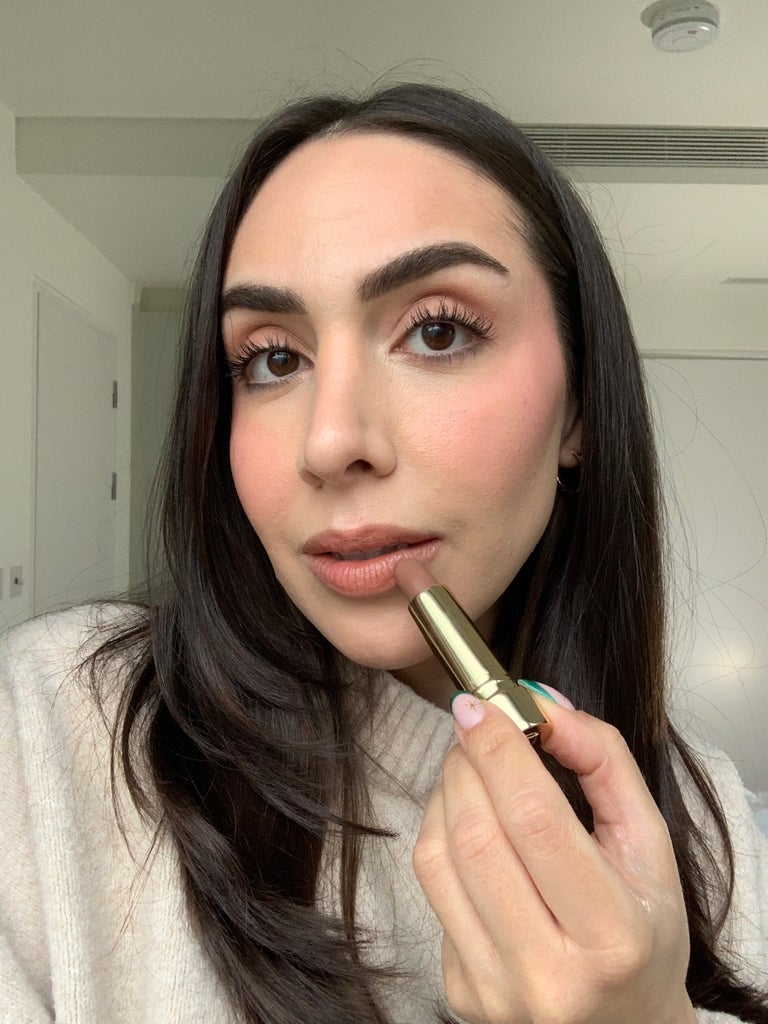 To me, this feels more like a tinted lip balm than a true lipstick — the name says it all, I guess! It glides on easily, giving a satin-like veil of color that feels moisturizing, thanks to squalane and sunflower seed oil. It only lasts a couple of hours on me, but because it’s so soft and lightweight, I just swipe it on like a balm. Here I’m wearing Slip, though I tend to prefer the pinker shades on my olive skin. I also wish the packaging felt a bit more luxe.