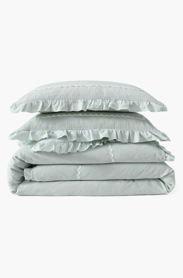 Viski Crystal Martini Glasses, $, available at NordstomImage Courtesy of NordstromI’m really into ruffles right now (much to my partner’s chagrin), and this is the latest bedding set to land in our bedroom. I love the white trim, but it was the seafoam green — a shade I think should’ve beaten Pantone’s Cloud Dancer — that really won me over. It makes the room feel calm and serene.