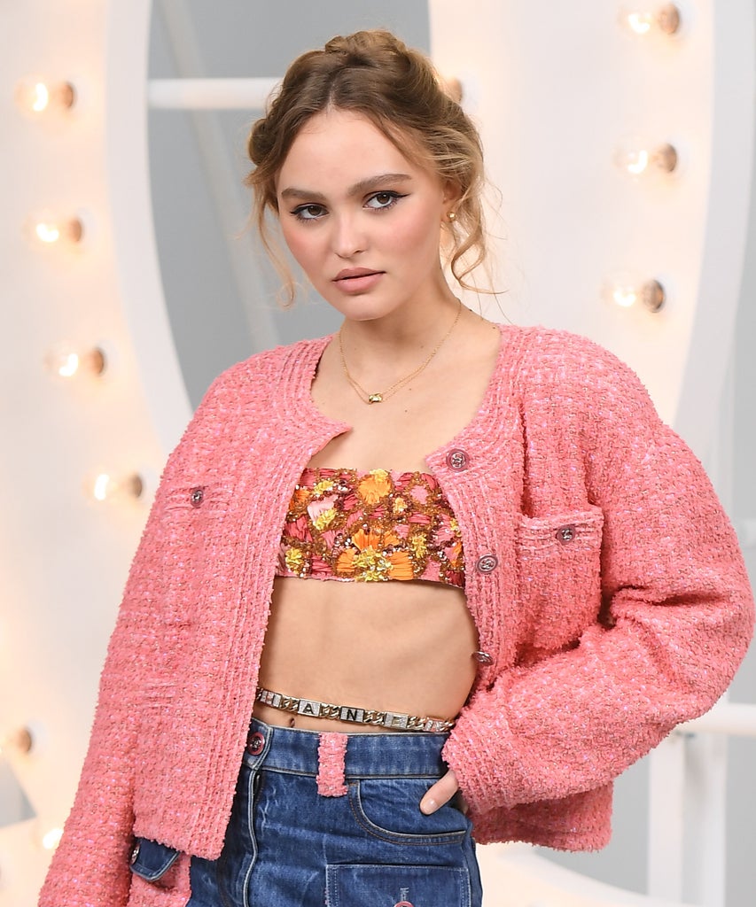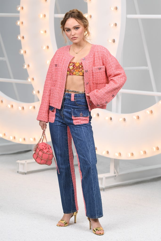 As expected, Depp arrived at the show dripping in Chanel. Her look, a Gen Z take on the brand’s iconic items, included hot pink tweed jacket, straight-leg jeans with matching tweed patches, and gold sandals. Under the brand’s signature jacket, she wore a multicolored tweed bra and a ‘00s-esque belly chain (yes, a belly chain!) with “CHANEL” written across her midriff in gold letters. She finished off the look with a gold, double-chain pendant and a pink leather bucket bag.