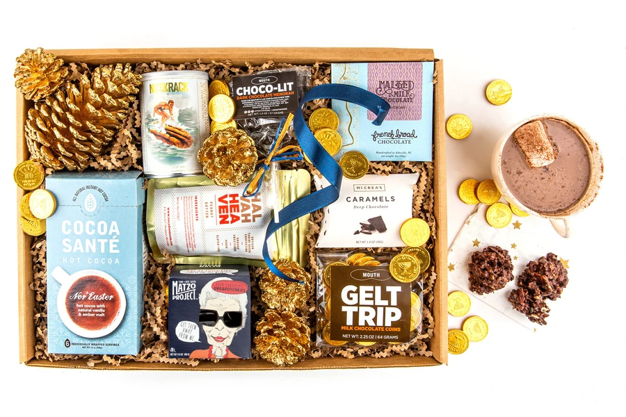 Those foil coins that come in yellow plastic mesh sacks are cute to play dreidel with, but have you ever eaten one? Feh! Step it up a few notches with this deluxe box of gourmet treats — including rich milk chocolate gelt from the food wizards over at Mouth.