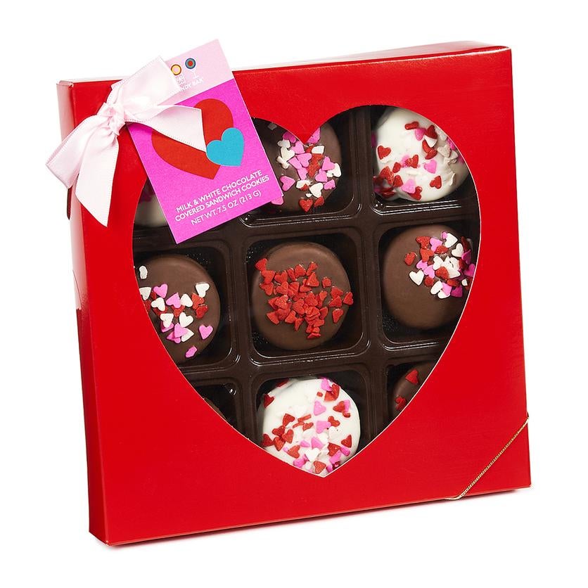 The heart cut-out on this box only shows a sliver of all of the chocolatey-goodness inside. Open it up and you’re met with nine cookie sandwiches doused and dipped in chocolate.
