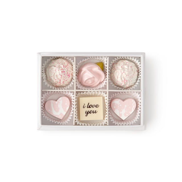 This six-piece dainty chocolate gift box is the definition of simple and sweet. Inside you'll find two milk chocolates with strawberry crisp, two dark chocolates with salted caramel, one white chocolate with strawberry crisp, and one plain white chocolate treat.