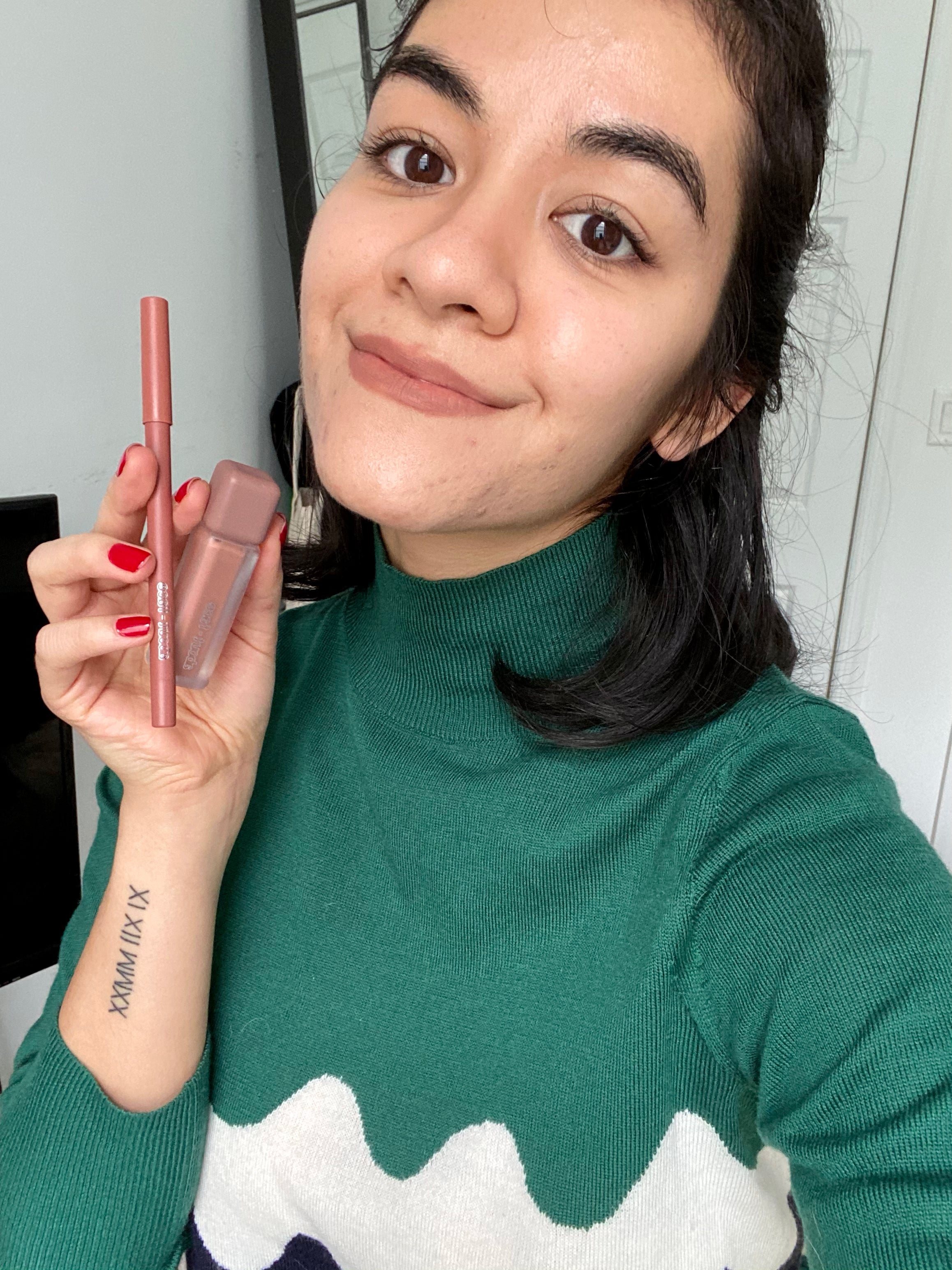 The first product I tried was the matte lip liner and liquid lippies. I'm constantly in search of the perfect nude shade, and these rosy cocoa shades really spoke to me. For my olive skin, the lip liner in Cradled is the perfect MLBB ("my lips but better") hue, and I chose to layer it with the liquid lipstick in the shade Slumber for a '90s-inspired brown lip.