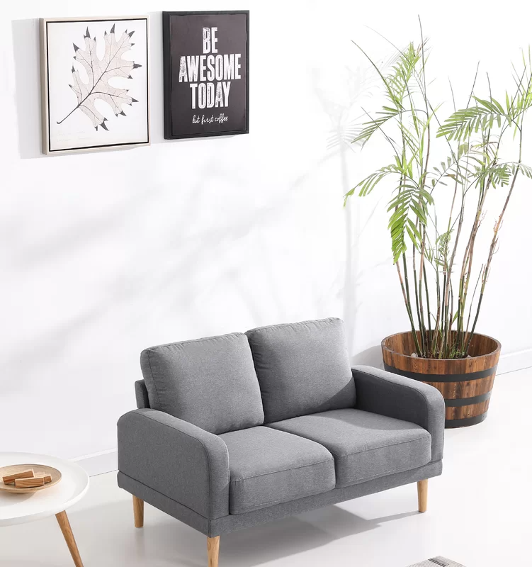 With a mid-century modern silhouette, this rubber-wood frame loveseat is covered in a soft grey-blue upholstery for an overall classic but still comfy feel.