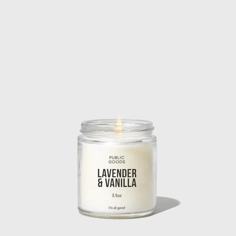 public goods Lavender & Vanilla Scented Candle, $, available at public goods