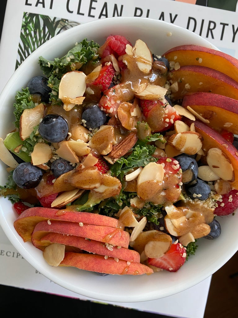 This recipe immediately caught my eye when I was perusing the book. I mean how could it not? Anyway, the Sakara ladies got me hook, line, and sinker with it. It’s basically a fruit party on top of a bed of kale with the easiest, most delicious honey mustard dressing I think I’ve ever had. I used a blender bottle to mix up all the ingredients, serve, and store any leftovers.