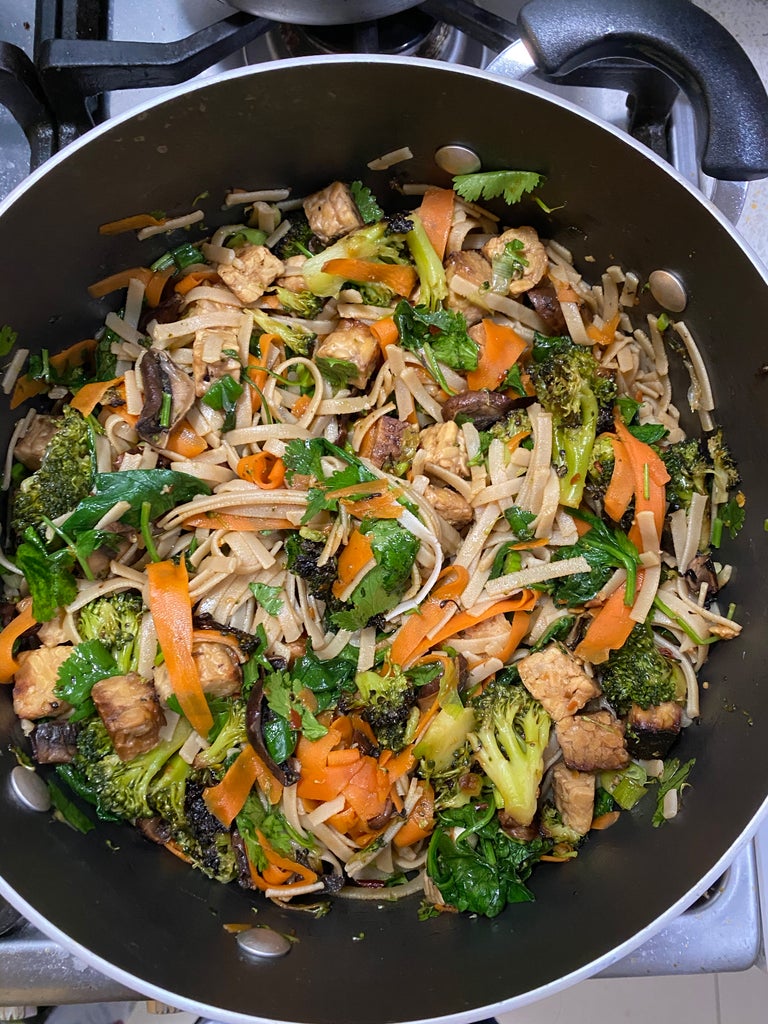 After peeling and cutting lots of veggies, it was pretty straightforward to cook everything up and serve. I actually ended up combining the noodles and the veggies in one pot (I love a one-pot wonder) even though the recipe doesn’t technically call for that. It admittedly doesn’t look as pretty on the plate, but I can live with that. The flavor was on point for a relatively simple sauce (sesame oil, sunflower oil, soy sauce, lime, and honey), and I ended up actually turning up the heat with some gochujang sauce from Whole Foods that I’ve been obsessed with lately.