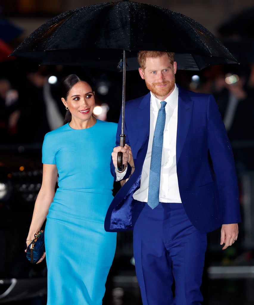 Markle paired her black, floral Giorgio Armani silk dress with a Pippa Small gold-and-aquamarine necklace, Cartier Love bracelet, and the same diamond tennis bracelet that Prince Harry used to craft her engagement ring, according to People. The bracelet, by Cartier, was once a part of Princess Diana’s jewelry collection. In 2017, Prince Harry took two diamonds from it to act as the side stones for Markle’s engagement ring. “The little diamonds on the side are from my mother’s jewelry collection, to make sure that she’s with us in this crazy journey together,” Prince Harry said during the couple’s engagement interview that same year.