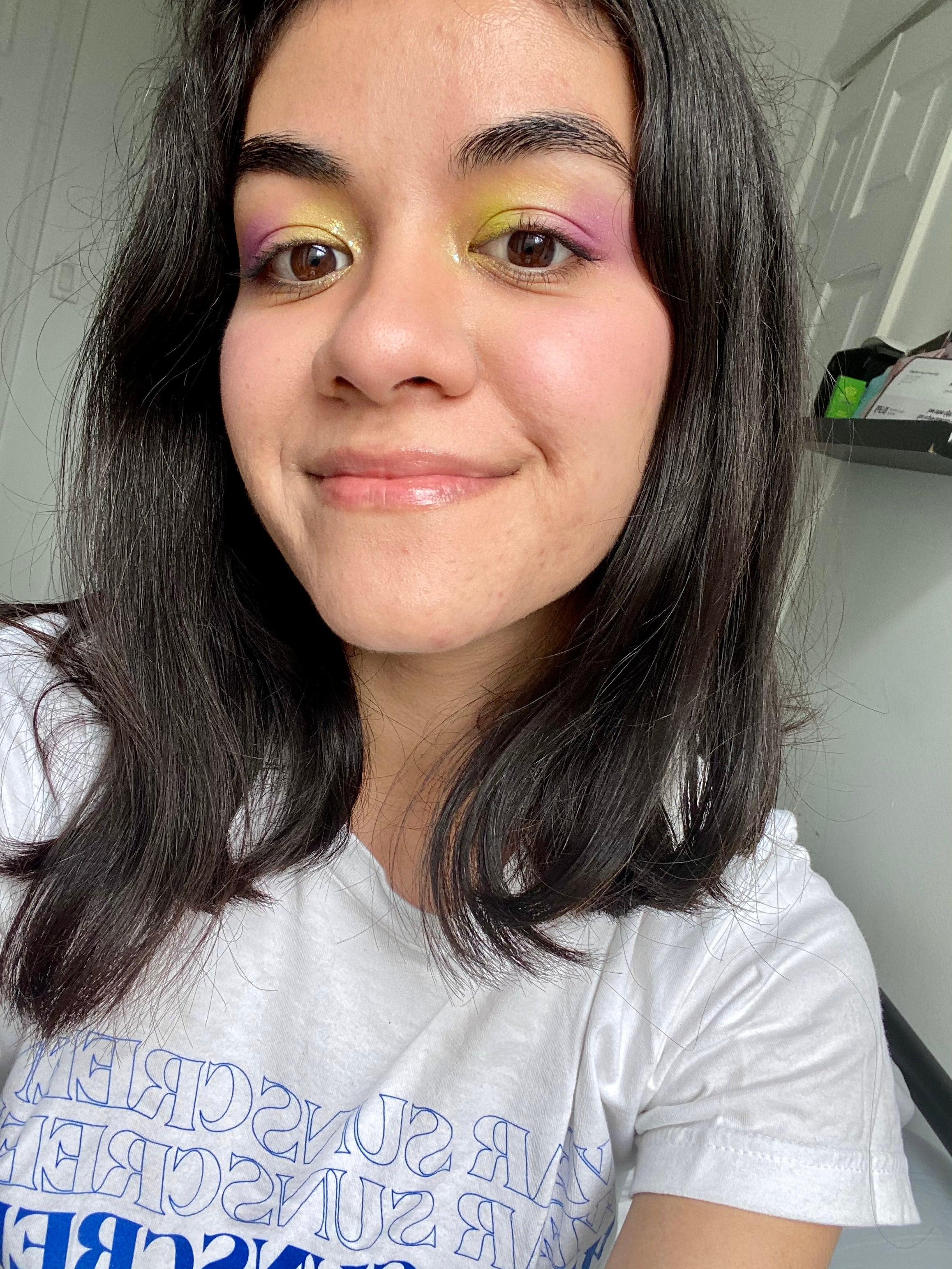 Eyes: I applied e (a matte lime) in the inner corner, and layered "Dear Diary" (a shimmery chartreuse) on top. On the outer corner, I applied "Hello Fabulous" (A shimmery lavender) and put "Digital Bean" (A matte violet) on top. To blend the two shades together, I applied "Outfit Rememberer" (a glittery icy lilac) in between the green and purple. To finish the eye party, I dotted my inner corners with the "Sing To Me Paolo" glitter gel.