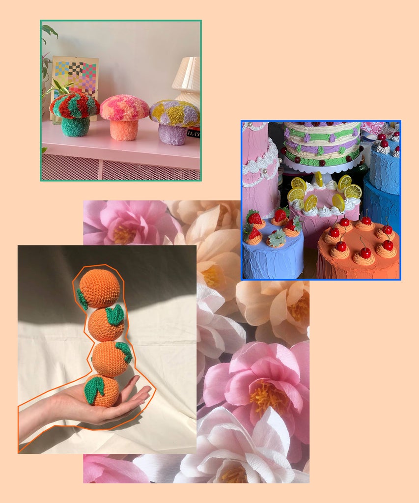 Other trends like checkerboard, bold patterns, textured finishes, and organic shapes are also at play here. Amy Gemmell of @amygemmelldesign was tufting rugs and wall flowers for much of 2020 but only turned to mushrooms in February of this year, based in part on her love of Murano mushroom lamps. Likewise, Jasmine, the creator behind @prettyshittycakes, has iced fake cakes in cow print and checkerboard print, as well as a swathe of muted and pastel shades.