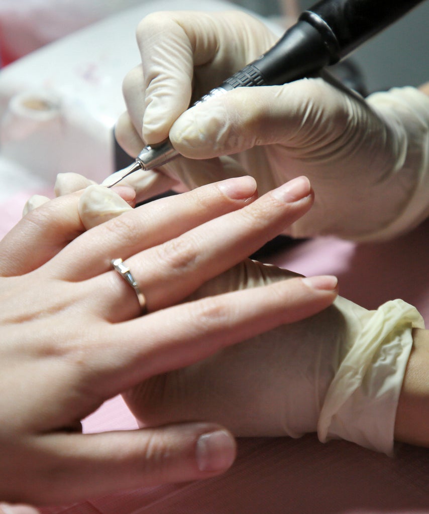 The closeup process begins with Sakakura cleaning Tozzi’s natural nails with alcohol and pushing back the cuticles, then using a drill file to remove any dead skin from the nail bed. Then she sizes each nail and applies the gel extensions. Once all ten gel tips are applied, they cure under a nail lamp and are ready for design.