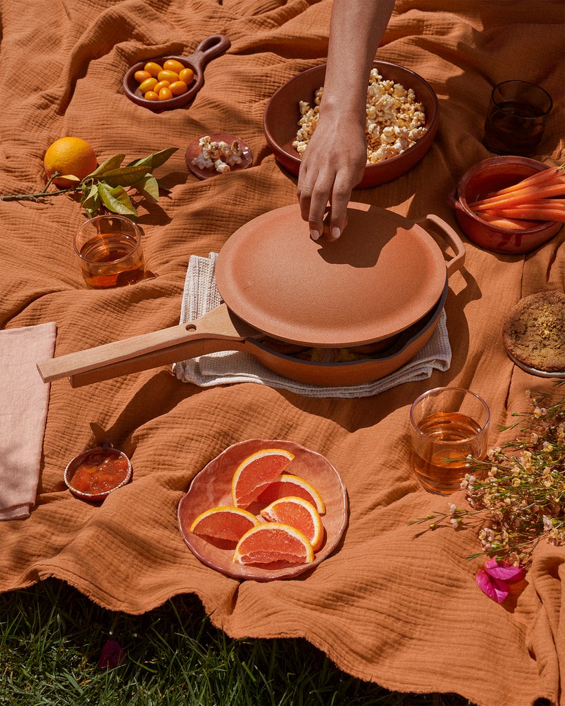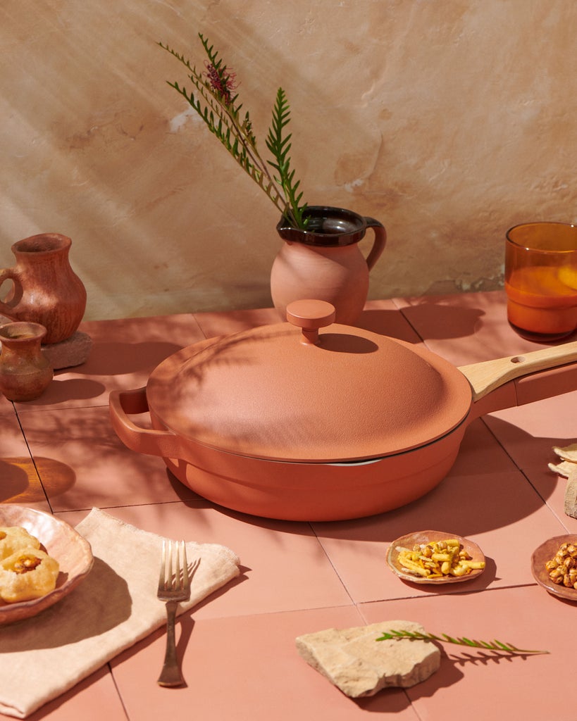 Plants scoot over, the classic clay pot is now a home for juicy chicken sauteés, crispy eggs, simple stir-fries, and more flavorful mealtime munchies. As an ode to spring harvest, Our Place just restocked six colors (lavender is still on vacay) of the iconic Always Pan AND debuted a brand new hue — which just so happens to be one of the hottest color trends of spring 2021: terracotta. The rustic warm ginger shade gives us strong down-to-earth vibes and was inspired by co-founder, Shiza Shahid’s, love for natural ingredients. Her eco-appreciation works in tandem with Earth day, taking place on April 22, and Our Place’s year-round focus on sustainability — but, we think this stylish wonder pot is a total knockout gift for Mother’s Day this May 9 as well. The chic colorway is officially up for grabs starting today; returning fans and Our Place newbies alike should head on over ASAP before Terracotta turns to Terra-notta in stock.