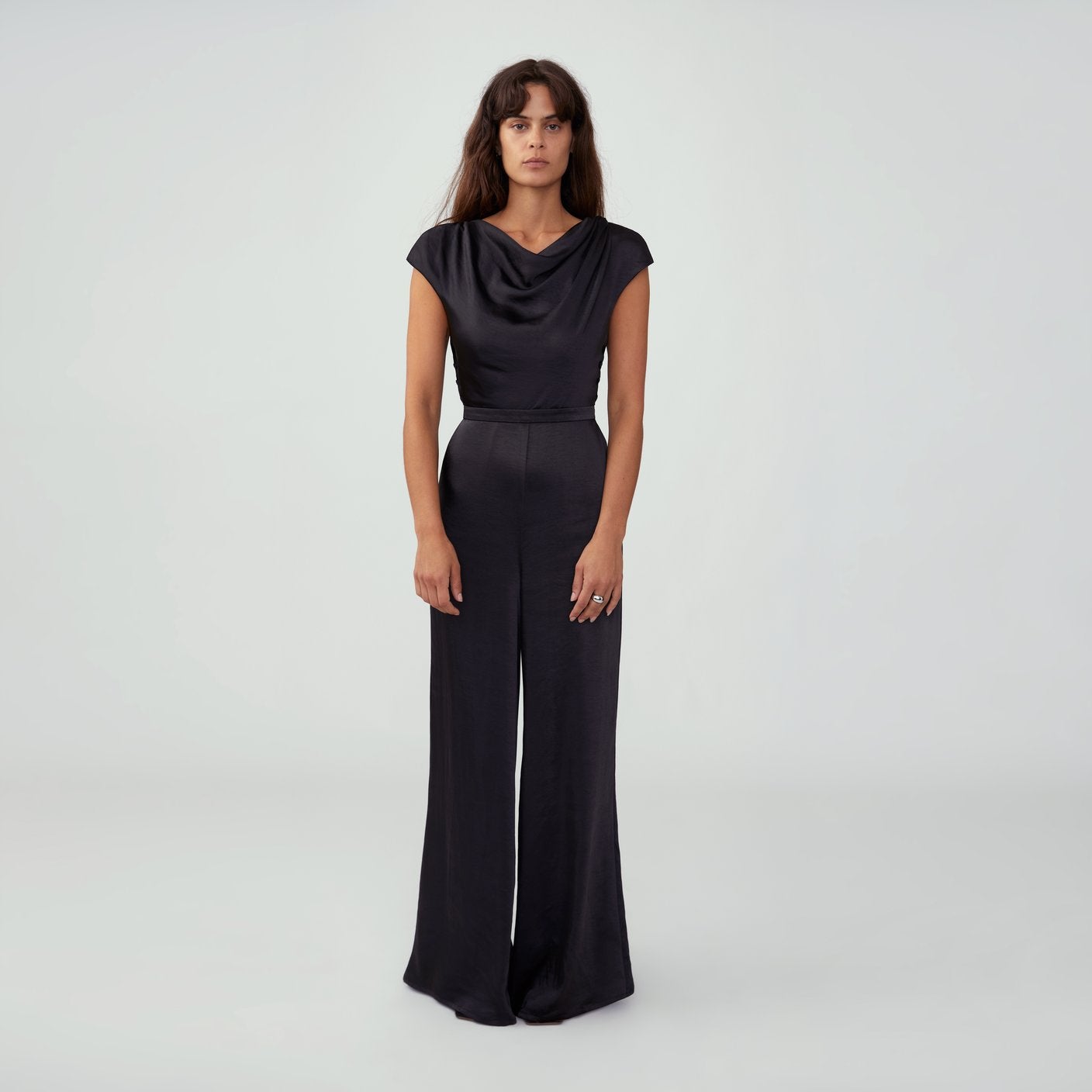 A draped top makes this simple, affordable jumpsuit a winning choice for a special day.