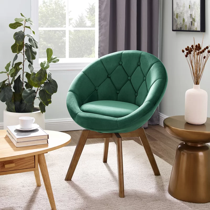 This bright and modern swivel chair is perfect for small offices spaces and reading nooks. It features a circular seat that's wrapped in tufted soft velvet and comes in an array of jewel-toned shades.