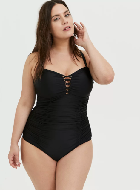 Torrid Black Lattice Ruched Swimsuit, $, available at Torrid