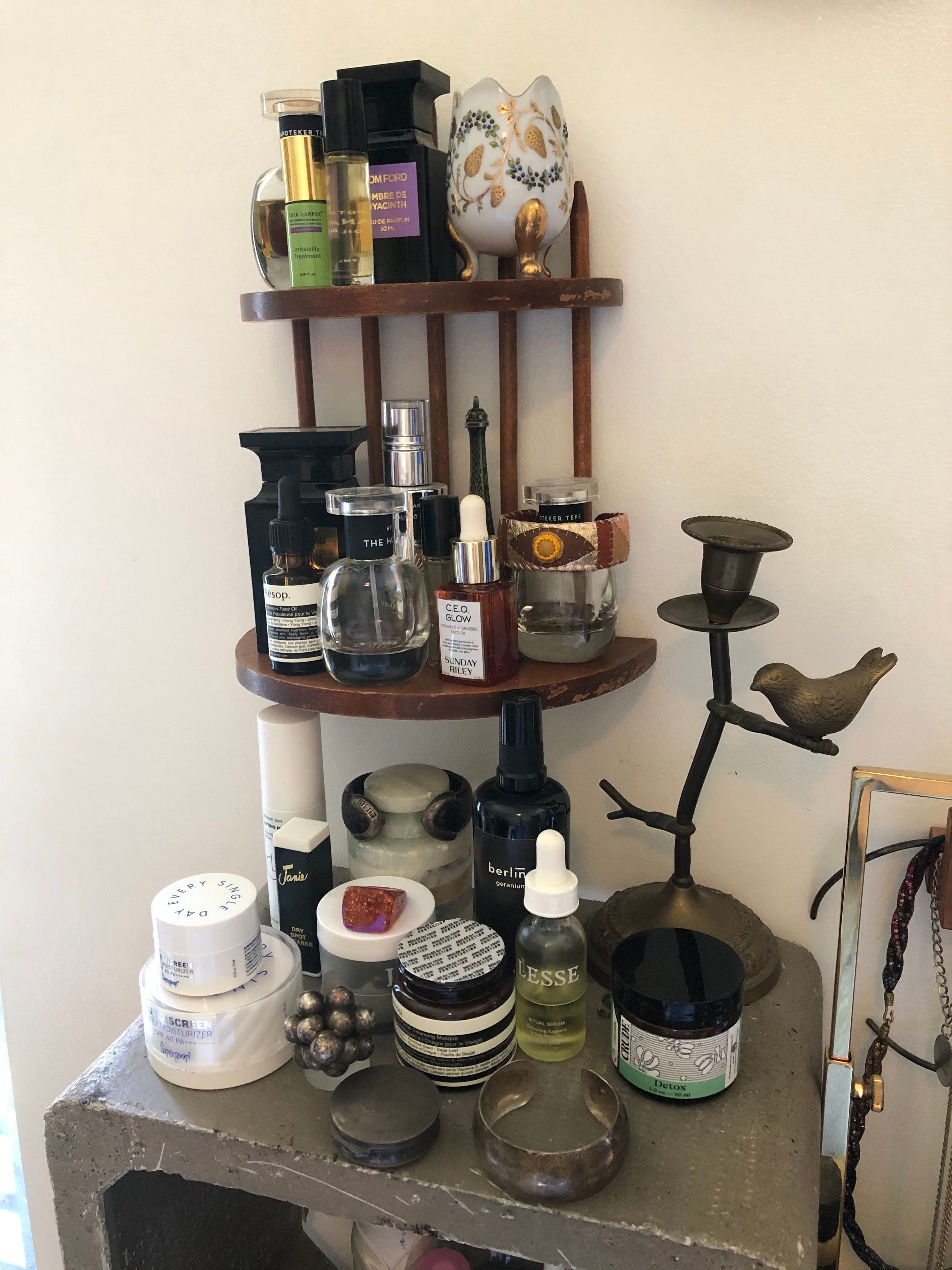 "Where’s Waldo? The MVP in this cluttered photo of my dresser is actually the little vintage wall-mounted shelf that I just scored on Etsy. Thanks to generous friends in the beauty industry and my own personal jewelry-buying habit, my bureau had become a hellscape of products and gewgaws that I knew could look intentional if properly displayed, and I wanted a vintage shelf to match the hodgepodge-y nature of my collection. I went sooo deep on Etsy with search terms like “display ledge”, “curio shelf”, etc., and found this tiny-but-mighty two-tiered wooden shelf from a New Jersey-based antiques and collectibles dealer. While this one-of-a-kind item is no longer available, you guys can still reap the benefits of my obsessive browsing if you go to my Etsy favorites page — I saved over 40 different mini display shelves before finally pulling the trigger, and most of them are still available. (I particularly loved this hand-painted butter-yellow spice rack.)" – Emily Ruane, Fashion Writer