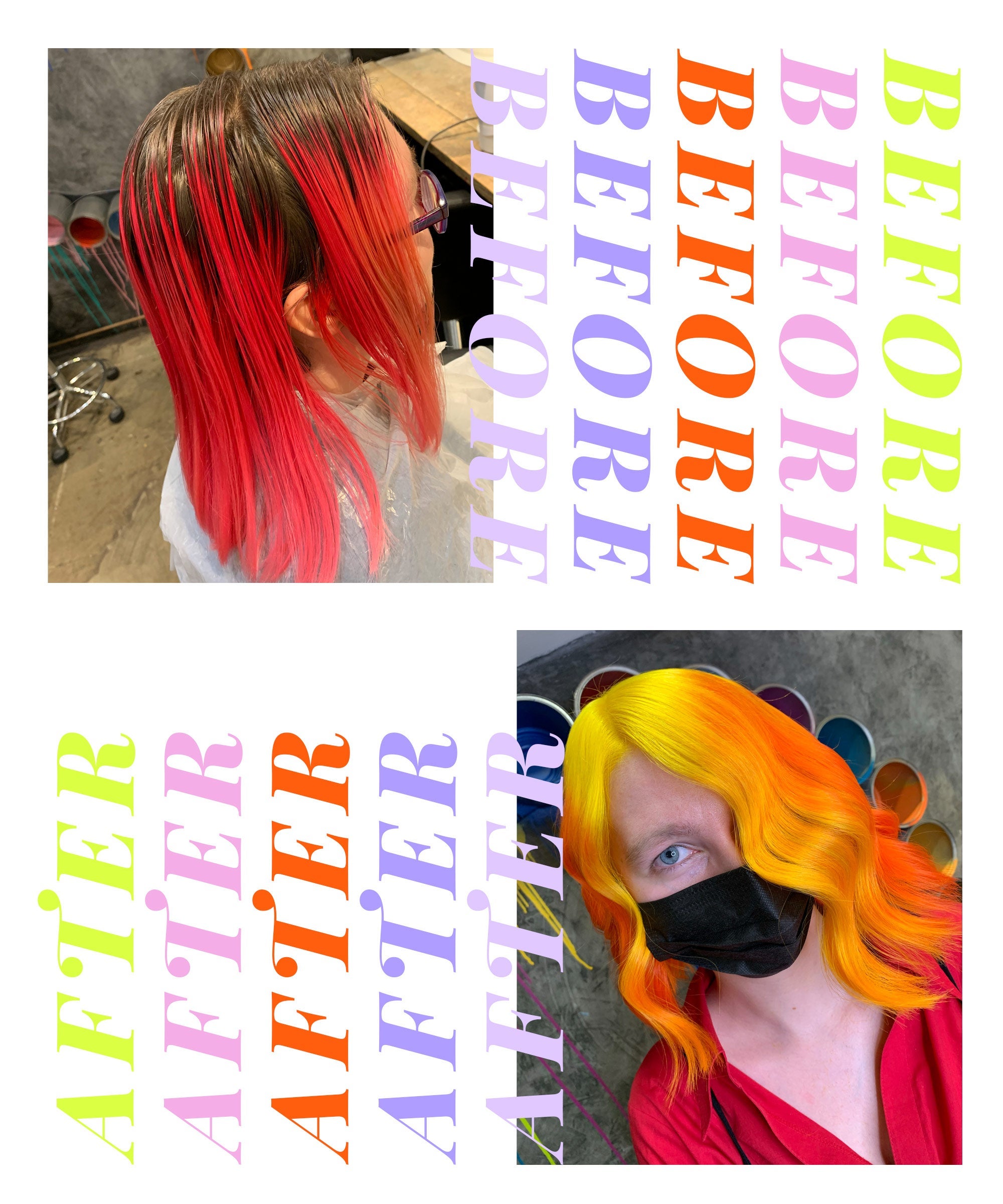 "During the most recent lockdown my hair grew out by a good few inches, going from a vibrant red with an orange face frame, to a soft pink after multiple washes. This time, I opted for a bright-yellow root bleeding down into orange for a sunset look. I go to Not Another Salon and see colorist Norman. The appointment is always an experience. I don't actually pick my own color; I allow my colorist to choose what he would like to do, and I enjoy giving him the creative freedom so it's always a surprise for me at the end!