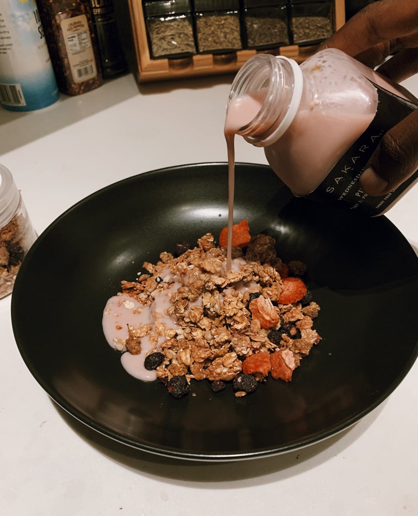 First, let’s talk breakfast: these aren’t your average milk-and-cereal combos — Sakara provides everything from sweet caramel-dripping muffins to cakes, granola medleys brimming with oat clusters, and sweet potato bowls that brought me into a full-on autumnal mood. Now, onto lunch: my favorite dish altogether was by far the pesto-pasta lunch — which consisted of five herbs and a creamy sauce that made me squeal. You can also opt-in to receive their ever-so-coveted Metabolism Powder: a chocolatey mix made from fancy things like black pepper piperine, antioxidants, and Ayurvedic herbs that promote digestion along with a natural dewy glow. Then, came dinner: my favorite dinner became a bowl made with purple cabbage and macadamia feta piled on top of earthy lentils, yellow beets, and sweet butternut squash — a vast list of ingredients I didn’t think could taste so flavorful. (And yes, I do know how to season my food!) This just in; Sakara’s newly released powder, the Super Greens Powder, features your daily dose of needed greens and plant-based protein all in a floral-covered package. It has a naturally sweet, mildly earthy flavor that mixes well with smoothies and blends into other recipes.