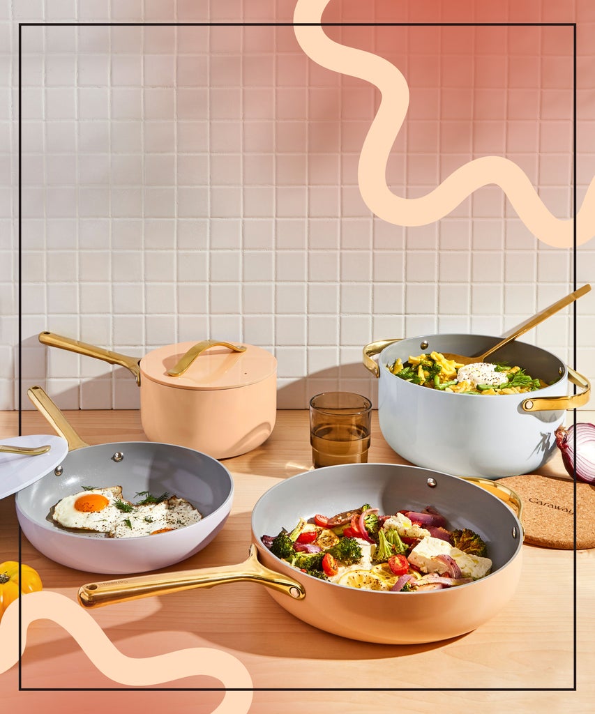 With 4.8 out of 5 stars and just over 15,000 reviews on-site, Caraway’s stylish non-toxic cookware is worthy of its previously sold-out hype. This morning, the critically acclaimed brand brought back its signature cookware set (ready to ship in July) in three new summer-perfect hues; a dreamy pastel peach, lavender, and sky blue each accented with gilded hardware. The $495 limited edition collection, appropriately named Full Bloom, features the usual pieces: a fry pan, saucepan, sauté pan, dutch oven, canvas disc holder for lid organization, and some magnetic pan racks for storage. If you find yourself fantasizing about these ethereal splashes of color reviving your kitchen this season, you’re not alone. Since Caraway’s popular pots & pans were already at the tippy tops of most cookware fanatics’ wishlists, we’re fairly certain the new colorways are about to sell out like proverbial hotcakes.
