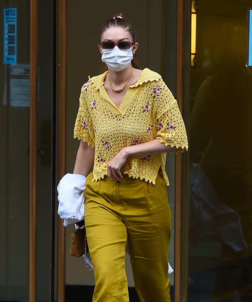 Crochet fashion is no longer reserved for your grandmother’s closet, and Gigi Hadid’s latest outfit is clear evidence. Over the weekend, the supermodel stepped out in New York City wearing a crochet crop top from Mango, paired with mustard pants, white slides, and a beaded necklace. The yellow top featured a polo-like neckline with short sleeves and embroidered flowers.