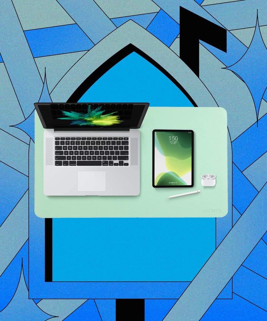 Well, for starters, if your work surface is worth protecting from scratches, stains, or just general wear and tear, a waterproof pad like EMINTA’s can serve as a protective layer to place your WFH stuff on (think: a sweating cup of iced coffee, that heated-up bowl of leftovers, uncapped pens, rogue lipglosses, keyboards, etc.). Another reason you may want to purchase a desk pad is that it also acts as a very large mousepad, in case your chosen surface is not conducive to wireless-mouse navigation. Finally, for the aesthetically-minded-yet-not-always-super-organized among us (me!), desk pads can easily elevate and streamline a cluttered or aimless workspace by providing a cohesive anchor — think of it as a placemat and your desk as the dining table.