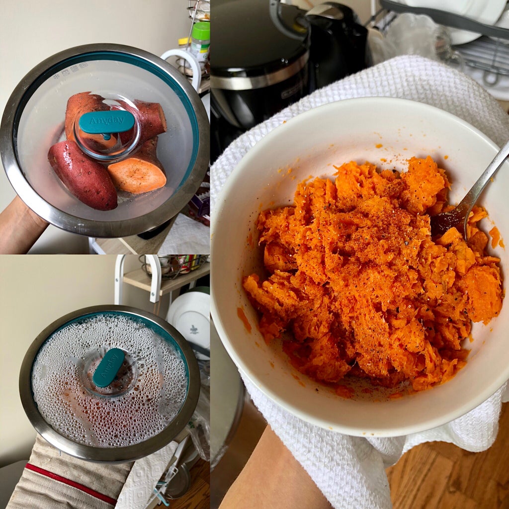 I started off the day with a sweet potato mash. My usual breakfast involves a protein bar and a cup of coffee, so it was nice to add some color to the menu. My microwave has a low wattage of 900, so I cooked these two sliced and diced sweet potatoes for eight minutes. The results were heavenly. I am no stranger to cooking potatoes in the microwave, but they never come out this tender and ready to mash. I easily peeled the steamy potatoes, quickly mashed them up with a fork, and seasoned them with salt, pepper, and paprika. But, if you’re looking for something more exciting, Anyday’s site offers more creative variations on ways to spice up your spuds.