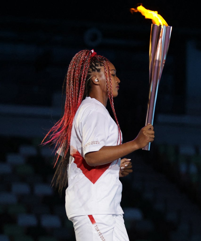 Per tradition, the torch-barring honor goes to a distinguished athlete from the host county. This year, Japanese tennis champion Naomi Osaka — who will be representing her home country in the Games — lit the torch. Not only did the tennis star fulfill the honorable duty, she also debuted a new hairstyle fitting for the occasion: fire-red box braids.