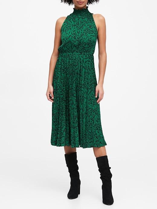 Banana Republic Satin Pleated Midi Dress in Green Print, $, available at Banana Republic Style Passport