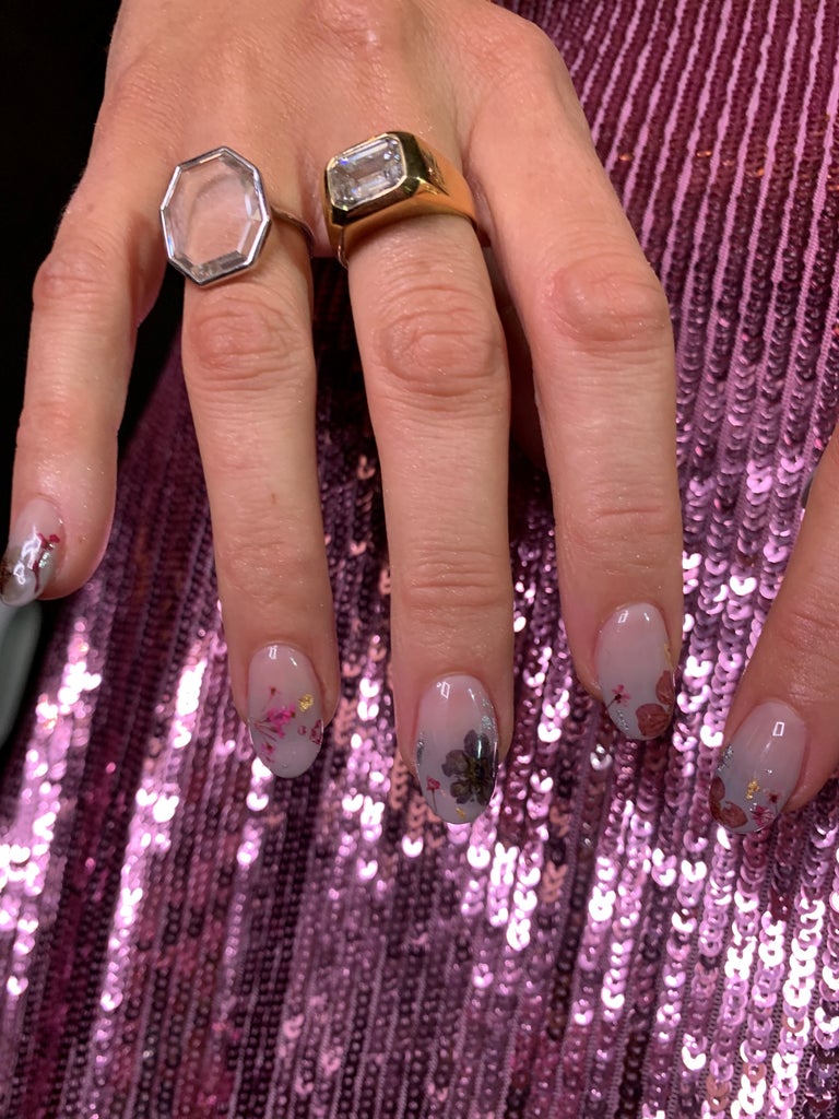 The actress wore a light pink and silver, sequined-encrusted, cut-out gown, styled with with chunky diamond jewelry and a dainty diamond chain woven through her ponytail. But the most stunning detail is also the most subtle: Lively’s gel manicure, with teeny-tiny dried flowers pressed into each fingernail.