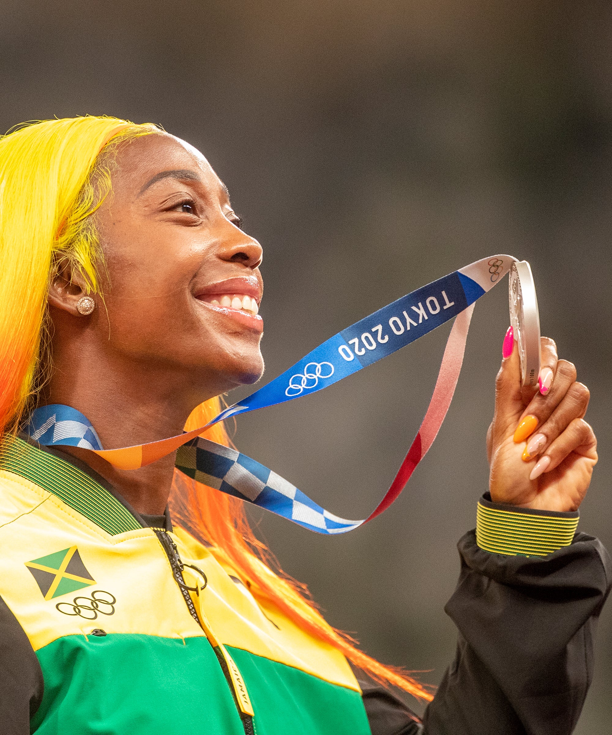 You can't miss Jamaican track star Shelly-Ann Fraser-Pryce, with her bright-yellow hair and long fingernails painted orange and pink.