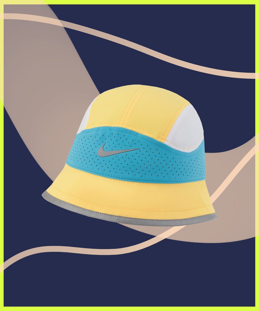 The lid in question was a daffodil yellow and chlorine blue “running a bucket hat” from Nike. Yes, you read that right. A bucket hat… for running. Street style meets athleisure. The hat first came on my radar when my editor sent a link to me as a lark. “Am I the only person who thinks this is hilarious?” she asked. “Picturing someone running by me wearing this is making me lol.” She clearly wasn’t alone.