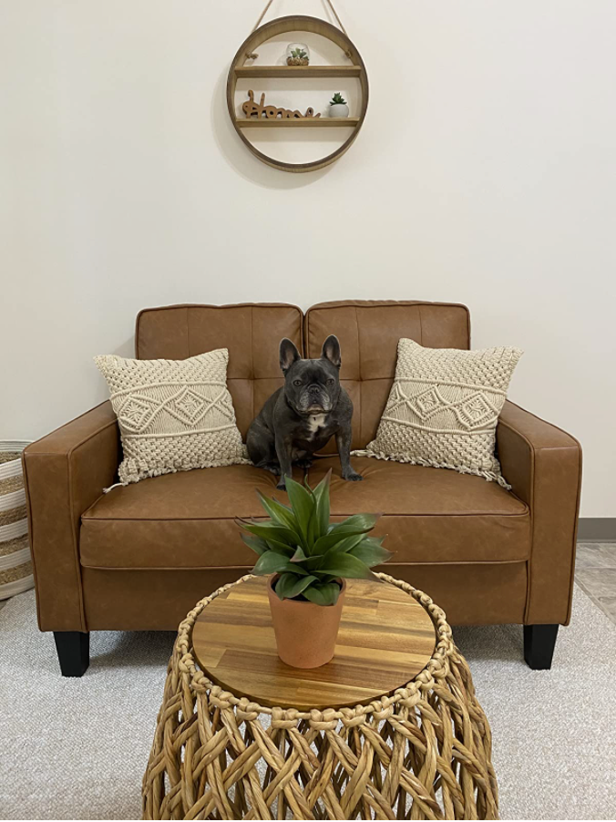 Reviewers Say: "If you’re considering this couch - do it! We bought it for under the big window in our living room and it’s the perfect pop of color. It’s so so soft and comfy!! I am very impressed by the quality too, my friends probably think I spent $500+. I would recommend this product to everyone! Note the dimensions before you buy to make sure it fits in your space. I paired with a white fluffy pillow and another tan pillow, so cute." — Shelby, Amazon Reviewer