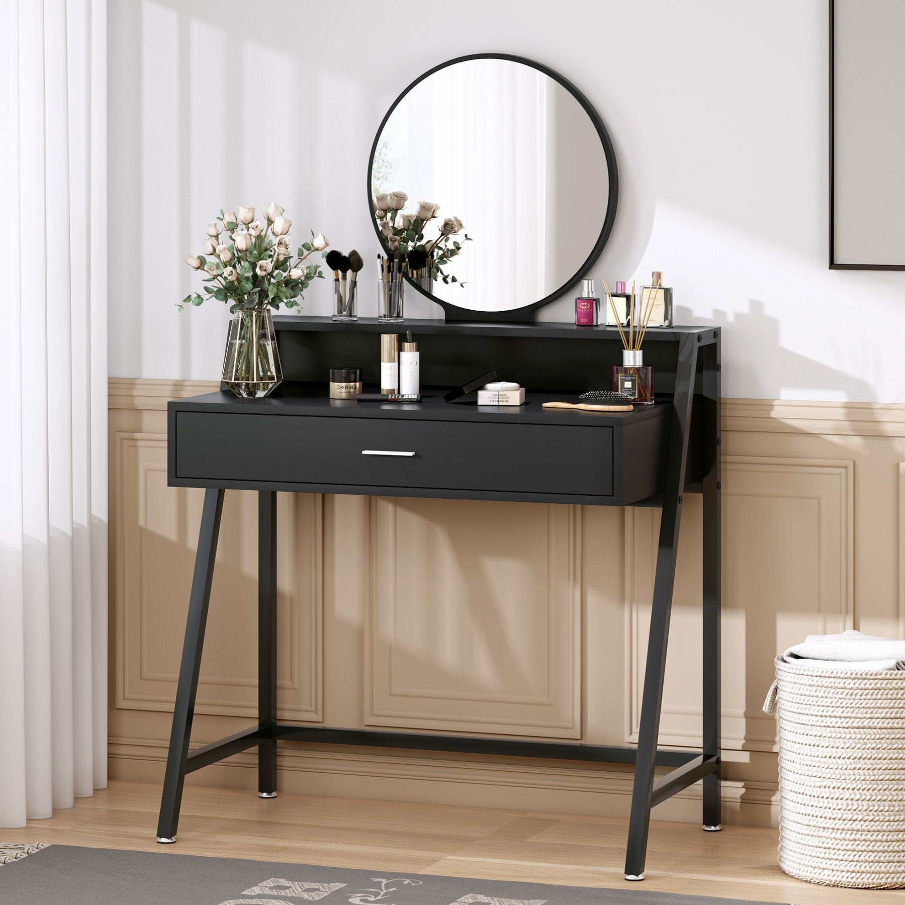 This sleek vanity can most definitely do double duty as both a place to get ready and a place to get your work done and store your unsightly office supplies.