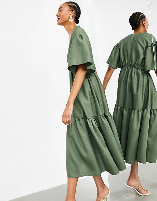 ASOS EDITION wrap tiered textured midi dress in olive green, $, available at ASOS