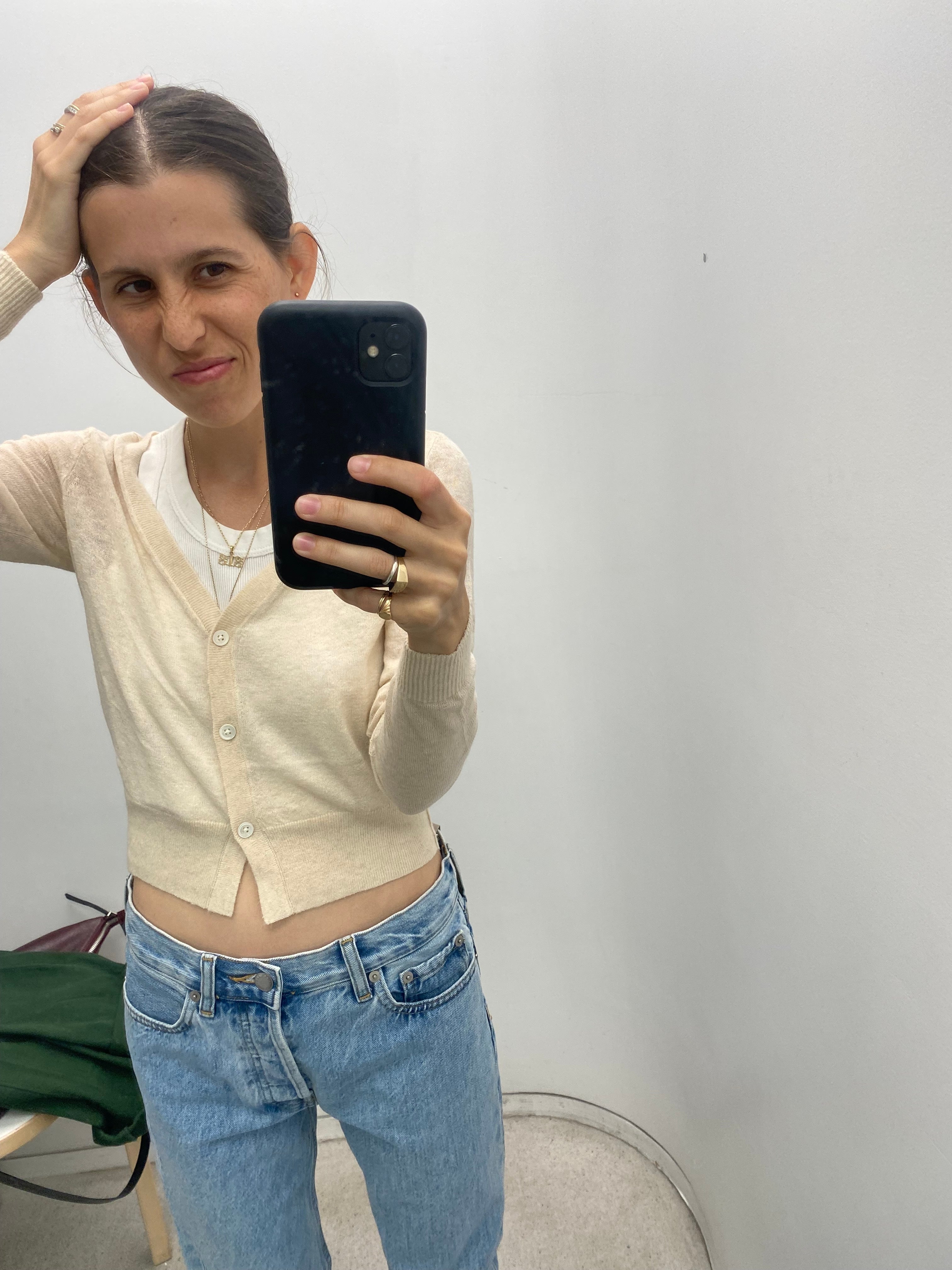 "I saw this new Everlane cardigan pop up [online] and knew I needed to go into the store to try it on. although this isn’t how's I’d style it, I’ve been looking for a little thin cropped cardigan to wear as a top and layer in the fall. this one is perfect and pretty great quality." — Kate Spencer, Affiliate Strategist