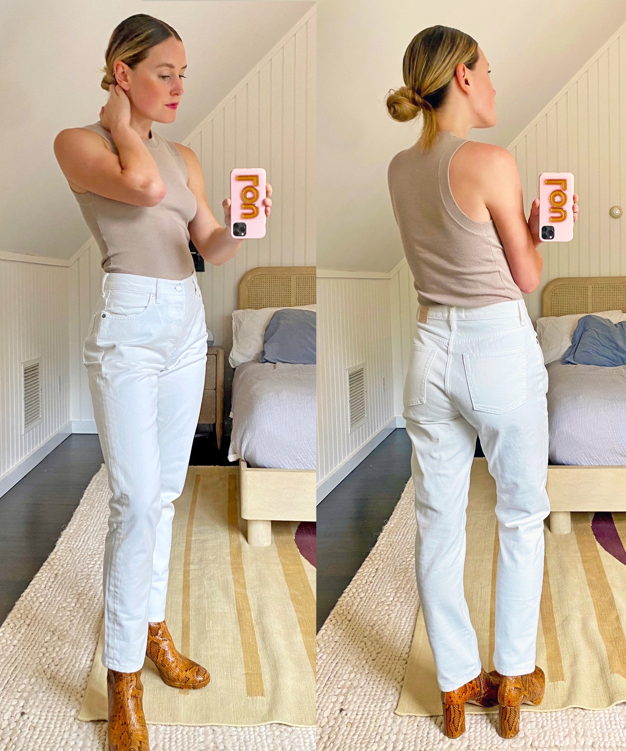 "After reviewing this pair of best-selling Everlane jeans, they became an unlikely MVP in my fall wardrobe rotation. The fabric is breathable and non-restricting and the high-rise coupled with tapered tailoring around the waist/legs and a looser fit in the butt/crotch worked wonders to provide me with a decidedly 90s-style booty pop. Although I usually favor a cropped hem, I went for the regular length available in my size (a 26) and was surprised to find it actually hit an appropriate ankle level (for reference: I'm just under 5'5'). I will note that the size 26 was a bit on the looser, but I assume they will shrink up a bit in the wash so wasn't too bothered by it. If you like a tighter fit, however, I’d recommend sizing down! They look easy-chic paired with chunky heeled boots and tucked-in tees." – Elizabeth Buxton, Deputy Director
