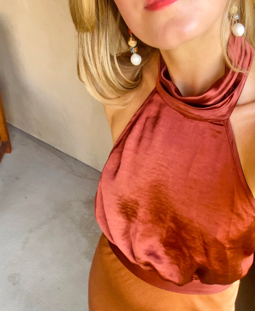 Lulus Spectacular Night Brown Satin Halter Crop Top, $, available at Lulus