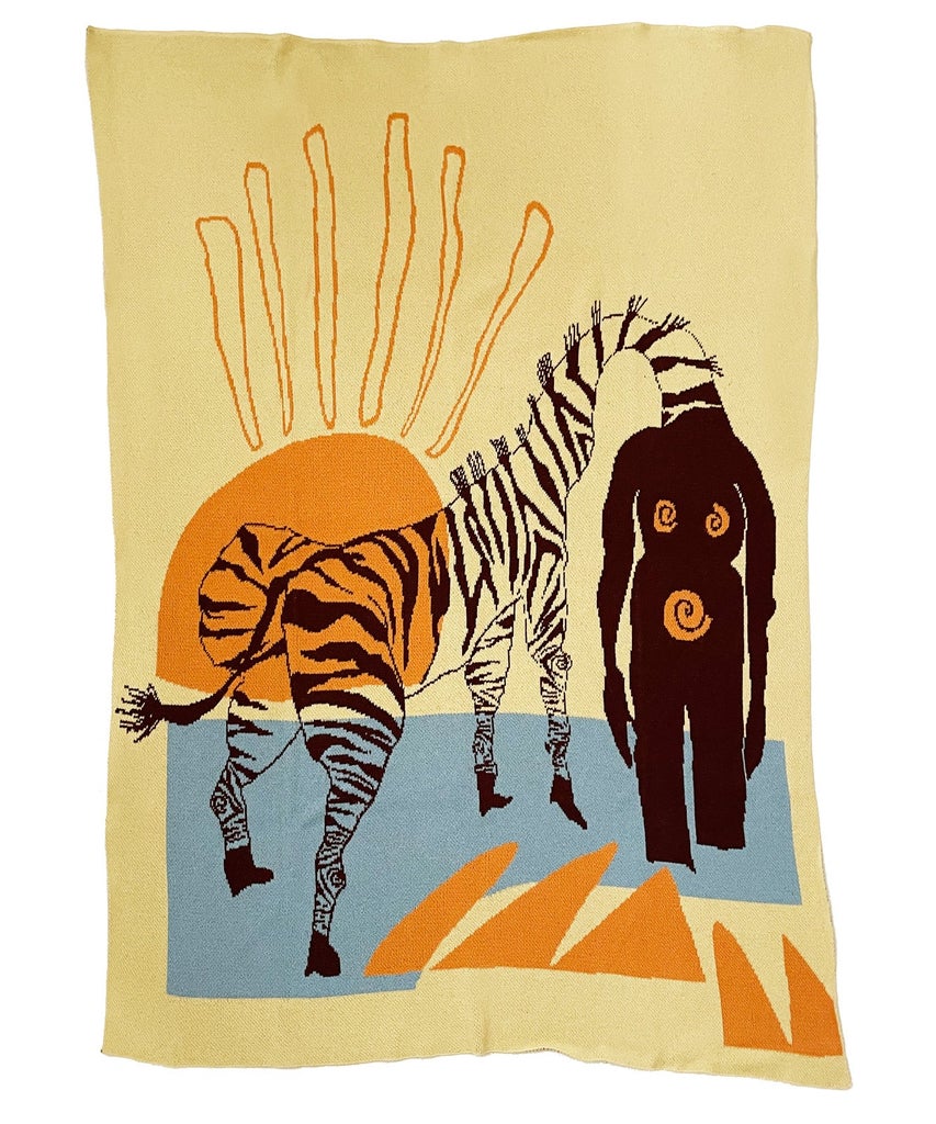 Each of the artist’s bold designs blend seamlessly with Cold Picnic’s vintage-esque, abstract textiles while simultaneously reflecting their own unique aesthetics and perspectives. We interviewed both creators, got some inside info from the founders, and reveled in never-before-seen art that doubles as a must-have home good. If we’ve already sold you on snagging a knit blanket, head over to Cold Picnic now, or scroll down to hear the voices of these BIPOC artists, below.