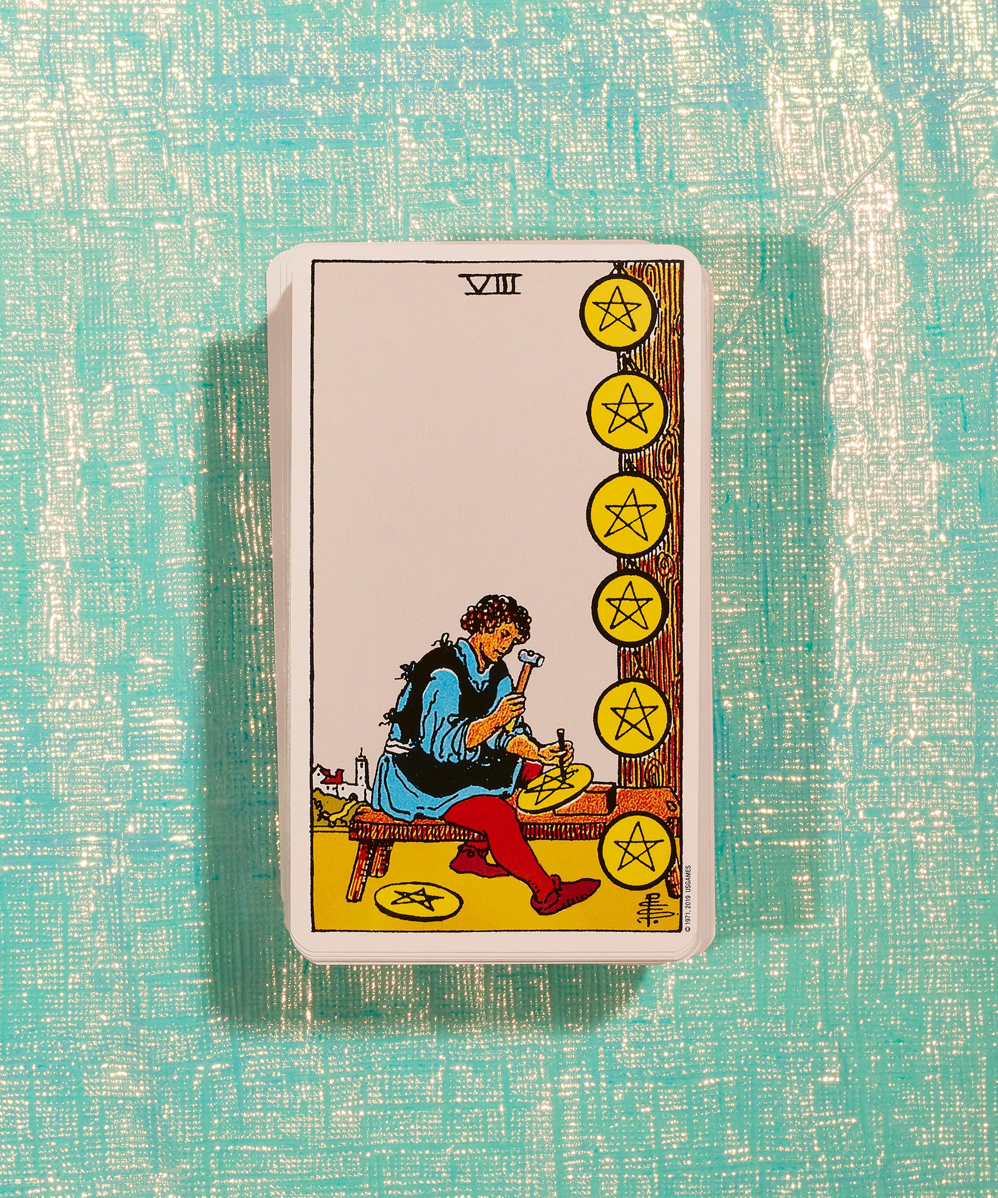 Next up, the 8 of Pentacles. This card is asking us to keep working on ourselves to reach our full potential, whether that's as romantic partners or just being a good friend in our other platonic and familial relationships. Now, we're acknowledging the work that needs to be done, and we can move forward."Going back to that 9 of Swords card, you can always improve your situation," Potter says. "Romance and relationships take dedication and patience."Photographed by Joel Arbaje.