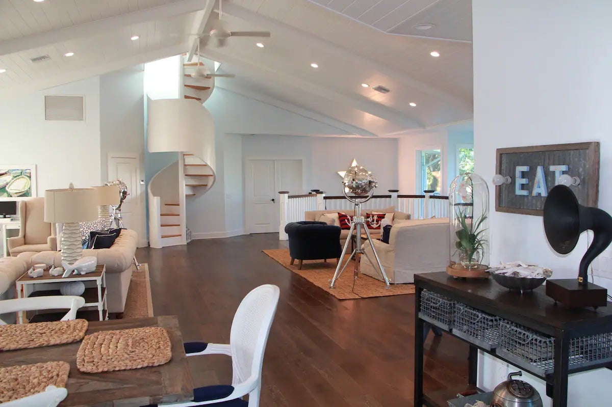The Space: Large beach-themed home perfect for coastal getaways — enjoy private beach access, spacious open floor plans, a gas grill, hammocks, and dine at restaurants in the center of town.