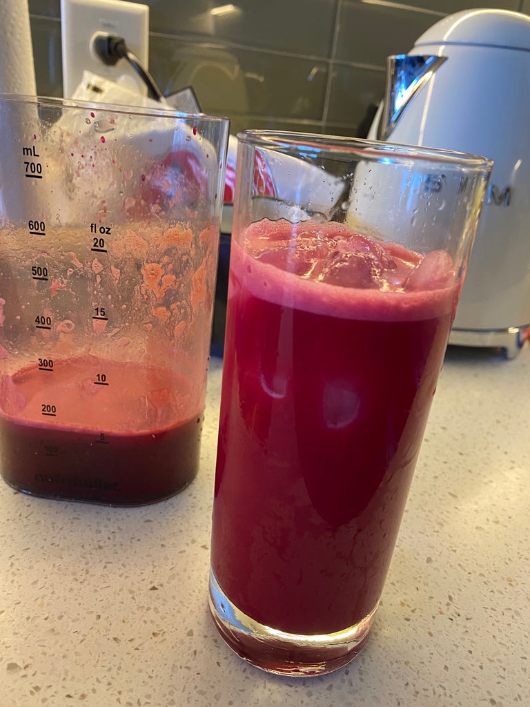 Like I mentioned up top, the main deterrent to investing in a juicer was the space factor. After unboxing all the bits and bobs, I was shook at how compact Nutribullet’s Slow Juicer was. At 17 inches tall, it’s solidly on the smol side, but still packs a punch. (I usually make about 20 ounces of juice at a time.) Another thing to mention: If you, like me, were wondering what the heck a “slow” juicer is, allow me to explain. This motor runs at 65 RPM (that’s rotations per minute), but other home juicers can run closer to 100 RPM, making them a bit louder. The Nutribullet one isn’t whisper-quiet by any means, but it’s not so loud that I can’t listen to a podcast while I whip up some juice. (This is a huge plus if you live with roommates or a light-sleeper partner.)