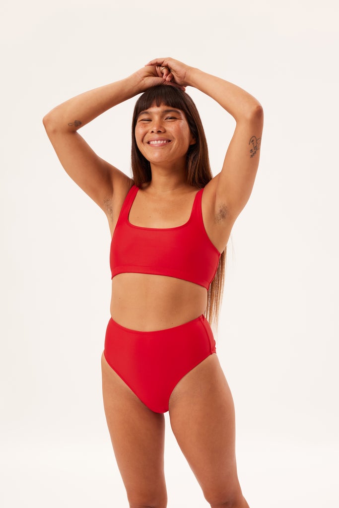 Active beachgoers unite! Girlfriend Collective’s Tahoe top is the ideal choice for those looking for more coverage to work up a sweat. It’s the brand’s sportiest separate, boasting a soft scoop neckline and a straight hem. The structure of the thick straps offers a medium amount of support that is perfect for high-impact beach activities. The matching Lake High Rise Bikini Bottom has a high-rise cut with full rear coverage, so you’ll feel comfy and secure in the water and on land.