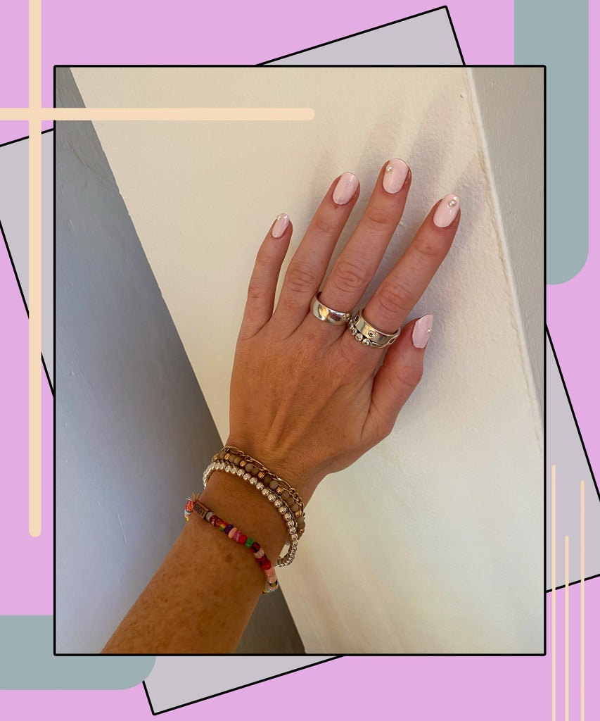 This took like 3 minutes and was easy enough because I wasn’t precious about the placement. Then, to get the stickers to hold, I added a clear top coat, Essie Gel Couture. Once that dried — and really, like immediately — I started to become pearl obsessed. Like, if I was an emoji, I’d have heart eyes made of mollusk shells. I loved how tiny and dainty they were and how they dressed up an otherwise-neutral nail. While I expected they’d pop off pretty quick, I was shocked that the pearls stayed on most nails, for a full week. The only annoying part, really, was the fact that the pearls caught my split ends when I ran my fingers through my hair. Otherwise, a complete success and now I want an éliou necklace.