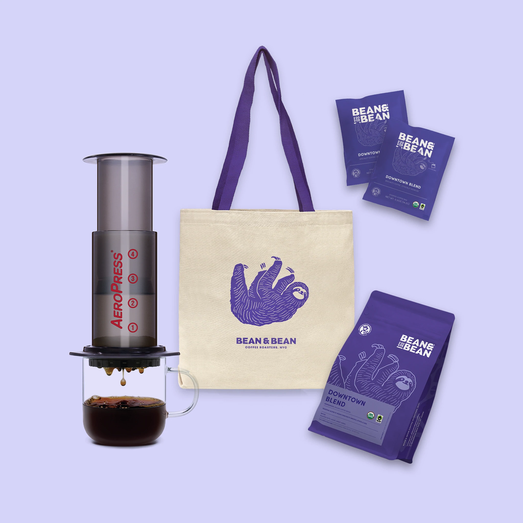 This coffee kit is meant for the traveling type. It includes an Aeropress coffee maker, a 12oz bag of pre-ground beans, an eco handmade tote bag, and two single-serving coffee steeping bags.