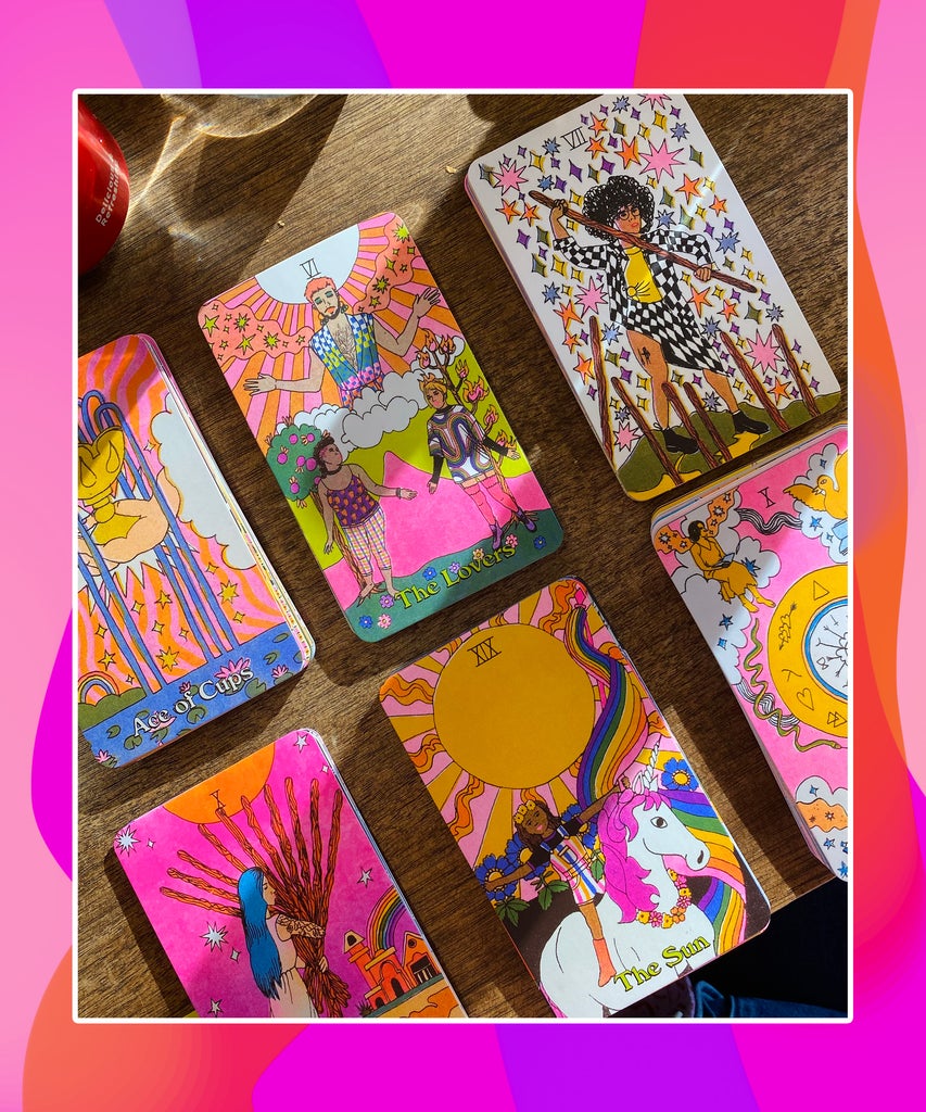 Are you queer? Are you into tarot? Well, the best of both worlds has finally landed in your rainbow-tinted shop-a-verse. The much-anticipated Queer Tarot deck from Ash & Chess, the LGBTQ-owned stationery brand extraordinaire and creators of The Gay Agenda, launched today after months of teasing on the company’s social media channels. Ashley Molesso and Chess Needham, a queer and trans couple, decided to “make a big ol’ gay, all-encompassing tarot deck.” Packed to the brim with bold colors and pride-flag imagery, this tarot deck is everything our gay little hearts have been yearning for. While other modern-day decks have queer representation in some of their cards, every single card in the Queer Tarot depicts nothing but gay, trans, and queer individuals. It’s hard for me to put into words, but fellow LGBTQ folks will recognize how this deck managed to capture the indescribable magic of queer joy. There’s not one straight vibe, trust me. Keep scrolling to see what I — a non-binary lesbian tarot card reader — really think of this wonderfully queer deck (spoiler: I love it). If you’ve been searching for a tarot deck that reflects what you and your community actually look like, the search is officially over.