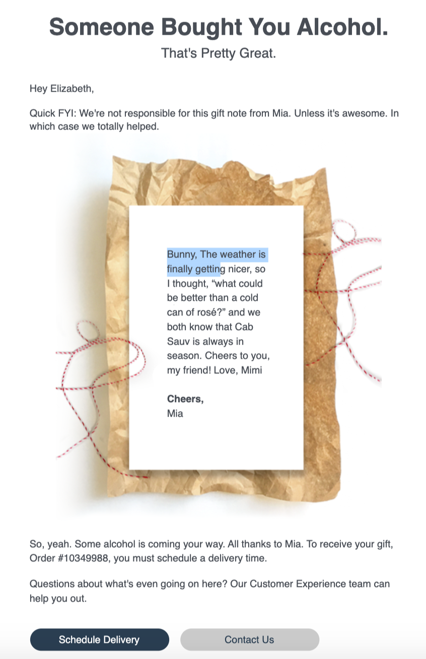 Wine is a classic gift, but not all states allow shipping alcohol, and ensuring someone over 21 is home to sing for the package makes delivery tricky. Drizly found a way around that: Browse thousands of gifting options availabe at your recpients address, and after you select your gift, they 'll get an email with a personalized note. They can then schedule the local delivery whenever works for their schedule.
