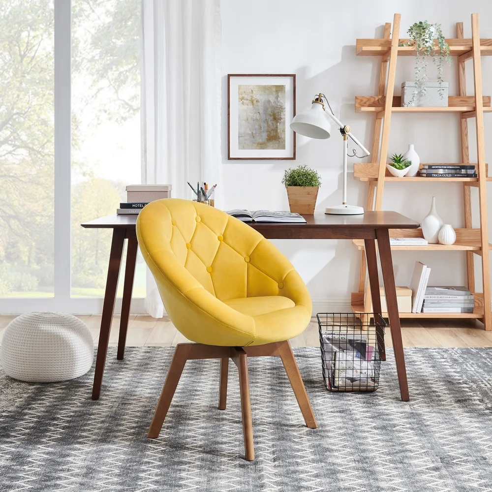 This bright and modern swivel chair is perfect for small offices spaces and reading nooks. It features a circular seat that's wrapped in tufted soft velvet and comes in an array of jewel-toned shades.
