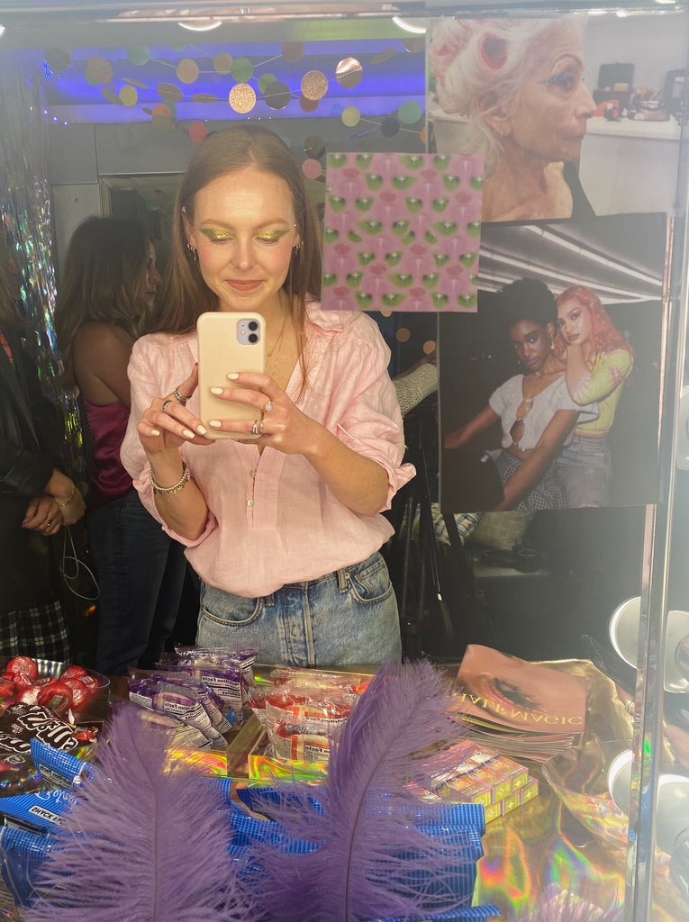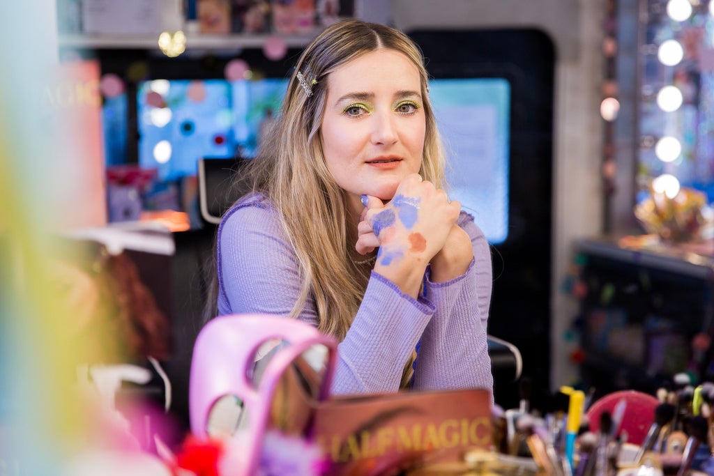 After months of design and formulation, Davy finalized her beauty brand, Half Magic. Last week, she packed the complete collection — mini Glitter Pills, a shockingly-flattering purple blush, rhinestones (of course) — into a replica of the Euphoria hair and makeup trailer, complete with Y2K polaroids stuck to the vanity mirror a craft-service table with M&Ms and Uncrustables. I climbed in, plopped into makeup chair, and Donni Davy used my face as her canvas — here’s everything I learned.