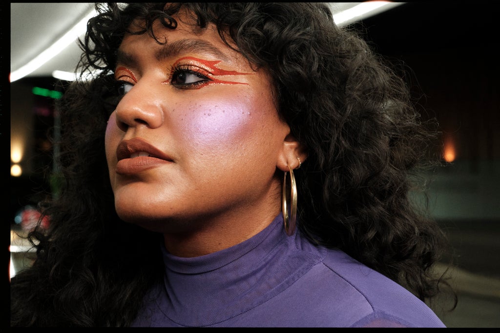 As an artist, Davy freehands winged eyeshadow. But for me, she recommends the Wing Magician, a yellow silicone tool in the shape of a four-pointed star that helps angle the shape of a wing. “Something really important to me in the brand is to be accessible and friendly to newbie makeup artists and people who are maybe just trying makeup for the first time,” Davy explains. “Sometimes we have to apply makeup looks very quickly. To create wings, I have experimented with Scotch Tape, which sort of works, but it’s not the best thing to use. This is fun because you can pick it up and move it where you need to, and it doesn’t actually stick to your face, you just hold it in place.”