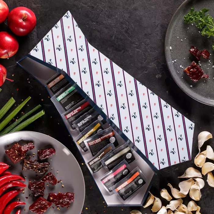 Man Crates dubs its Jerky Tie as the perfect gift for the "classy carnivore." One box includes 10 unique multi-flavored beef jerky bits (Habanero, Root Beer, Whiskey Maple, and Root Beer Habanero, to name a few).